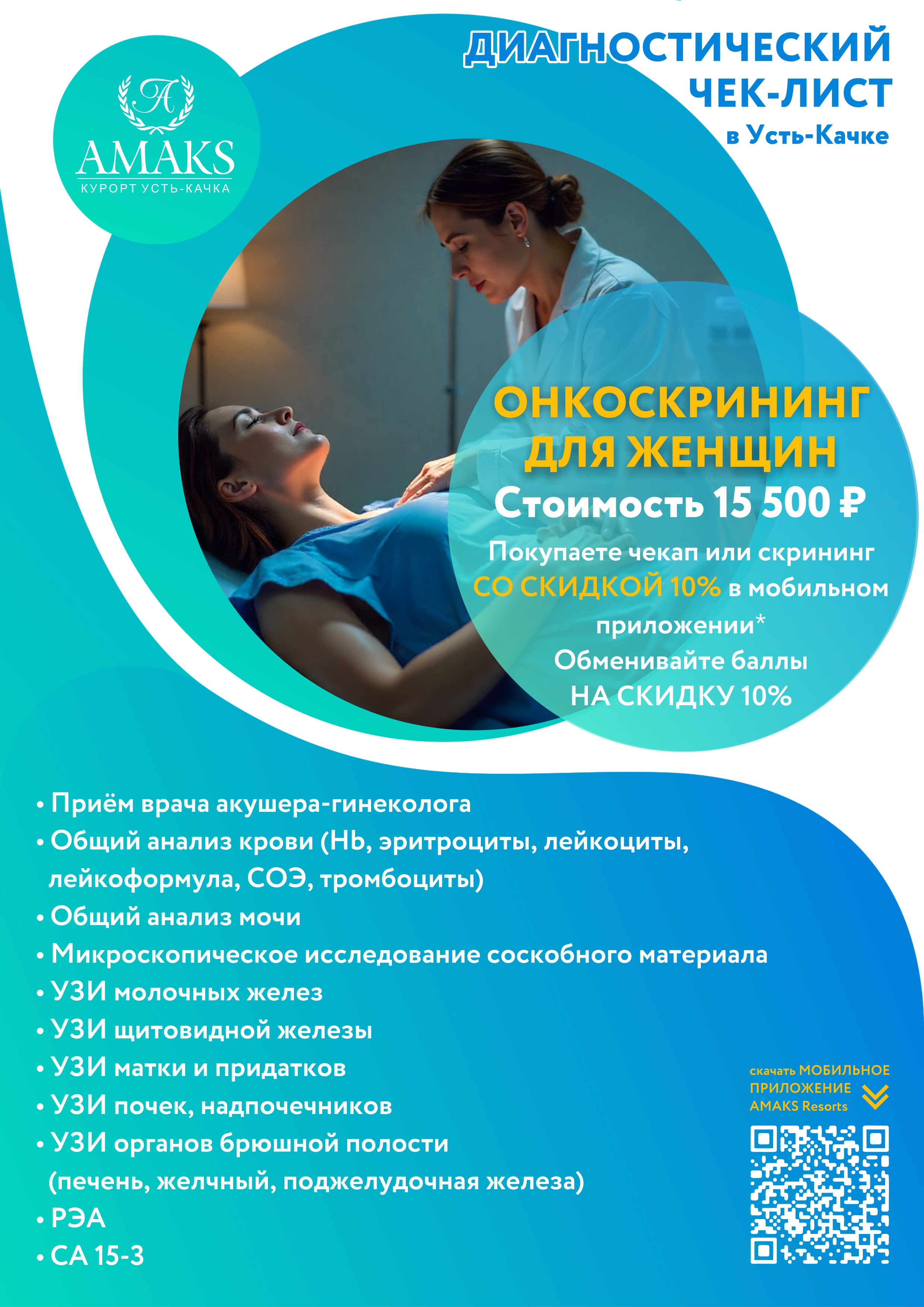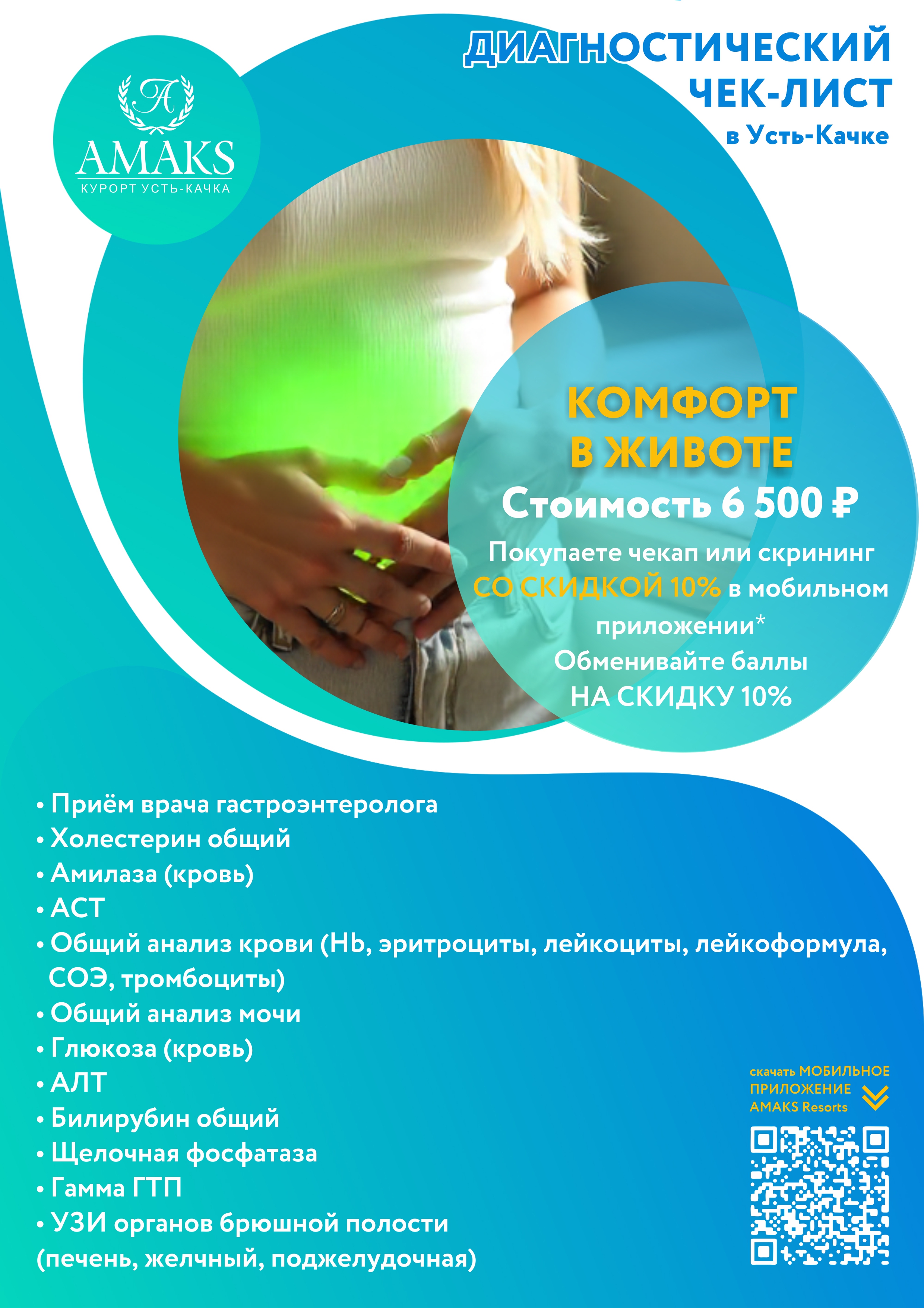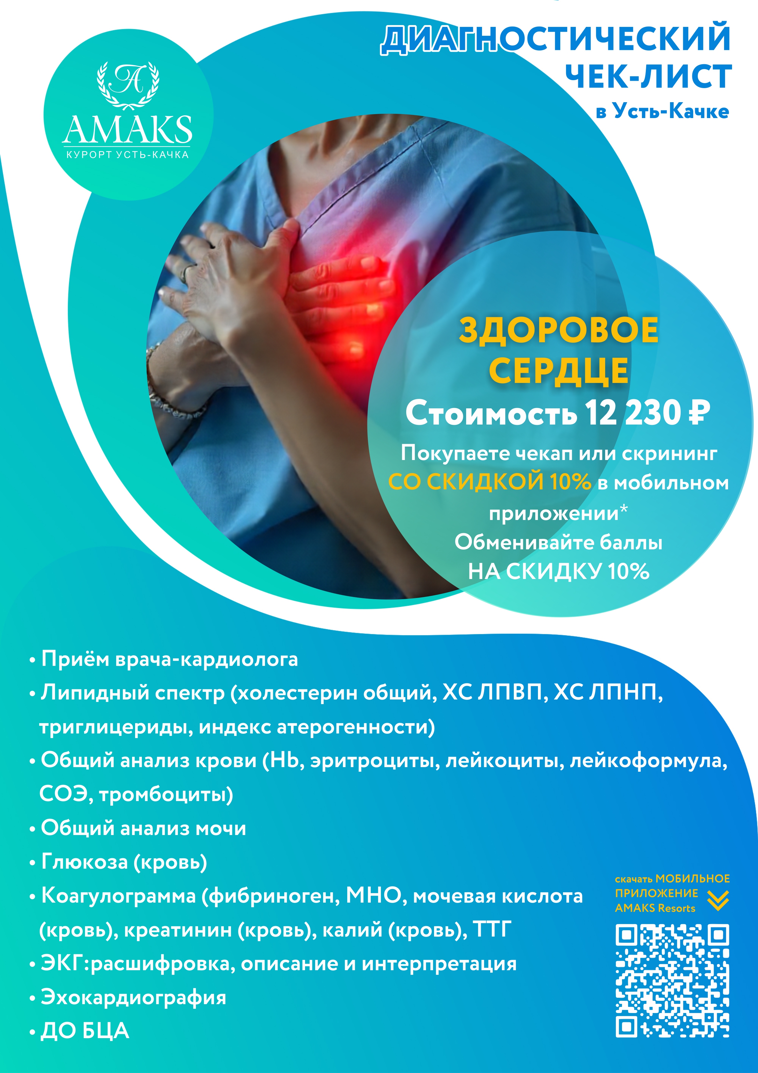 There is no need to stand in queues, adjust your work schedule and ask for a doctor's appointment, you can come to AMAKS Ust-Kachka Resort and get examined as soon as possible.
